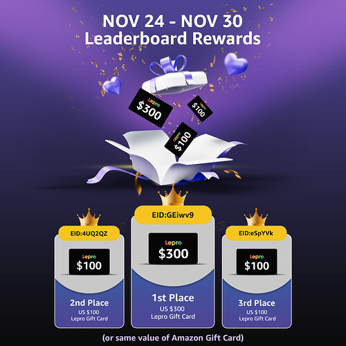Congratulazioni a EID:GEiwv9, EID:4UQ2QZ ed EID:eSpYVk per aver vinto i premi settimanali!