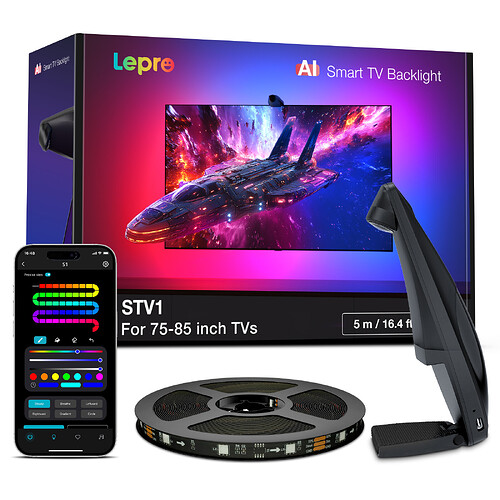 This TV ambient light strip uses a compact camera mounted on your TV to capture the screen in real time. It analyzes the colors at the edges of your picture and drives the LEDs so the wall around your TV matches the action—perfect for movies, games, and music. Fits 55–65" and 75–85" TVs, installs with adhesive in minutes, and includes modes for Screen Sync, Music Reactive, and Scene Presets. Control brightness and color in the app; game-friendly low latency keeps fast scenes smooth.